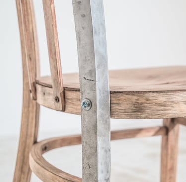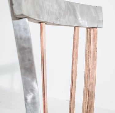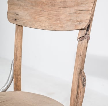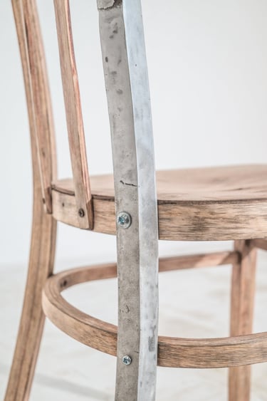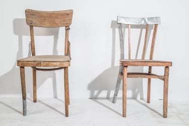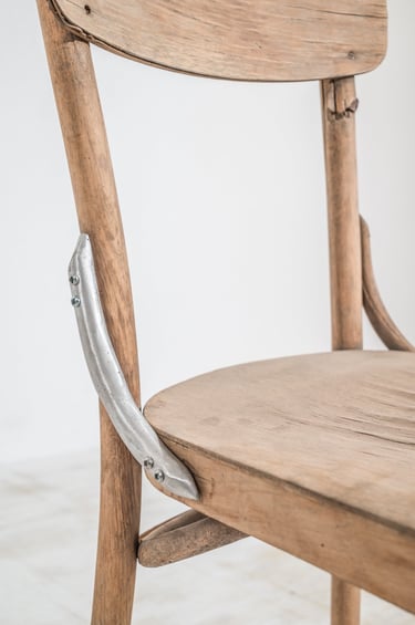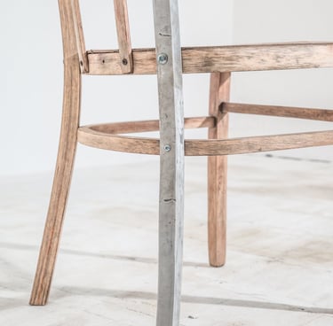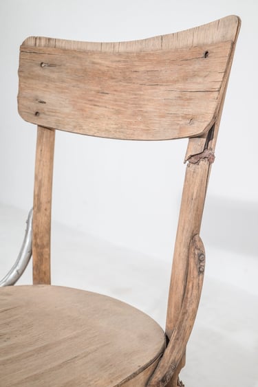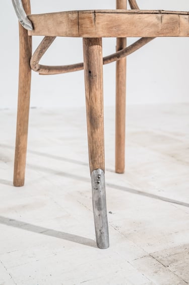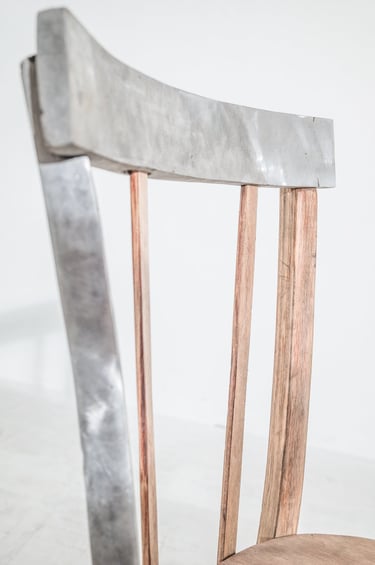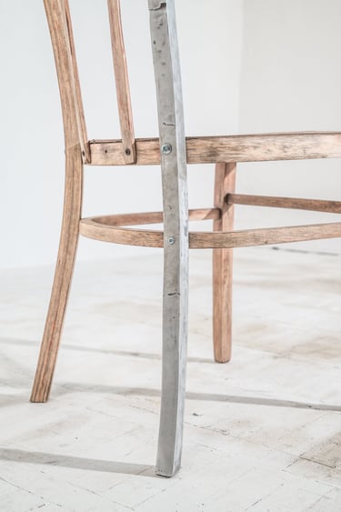The two chairs, damaged by explosions and then repaired using melted missiles, are mounted on the wall. The object, transformed into a sculpture, takes on the aspect of a portrait that bears witness to the visible or silent scars of civilians enduring the war.