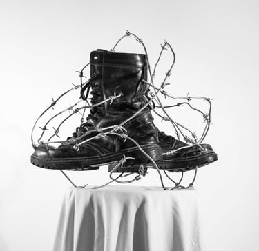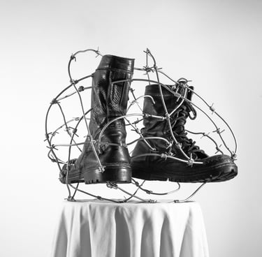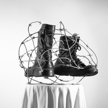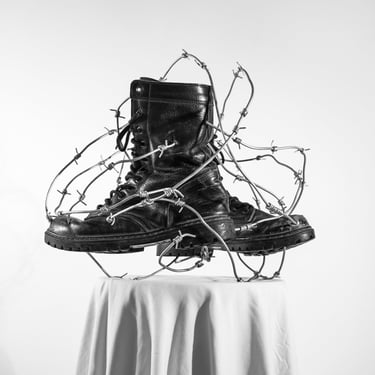 After finding the boots of Russian soldiers in the trenches, Alexandre Henry decided to make with them a representation of the resistance and determination of the Ukrainian people in the face of foreign aggression. The Russian boots surrounded by barbed wire illustrate the challenges and difficulties faced by the Russian army in its attempts to conquer Ukraine.