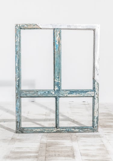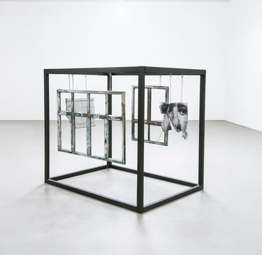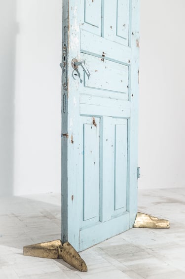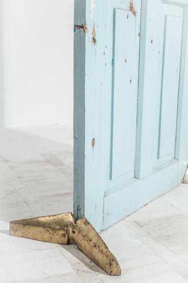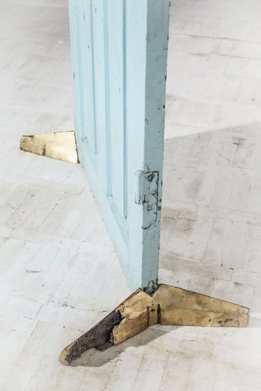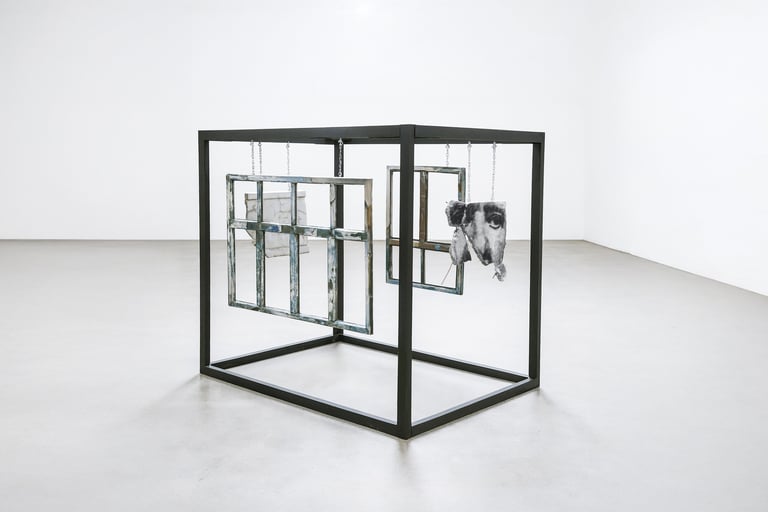 « Walls Remember » is an installation in which portraits of Ukrainians, printed on fragments of walls salvaged from rubble, are suspended on either side. Civilians who have lost their homes appear fossilized within these remnants, re- duced to fragile traces of existence. On the opposite side, windows are reconstructed with aluminum prostheses, cast from melted-down Russian missiles. Together, these elements form the silhouette of a house frame. It is no longer only the memory of destroyed houses that emerges, but also the echo of lives that collapsed alongside their walls.
